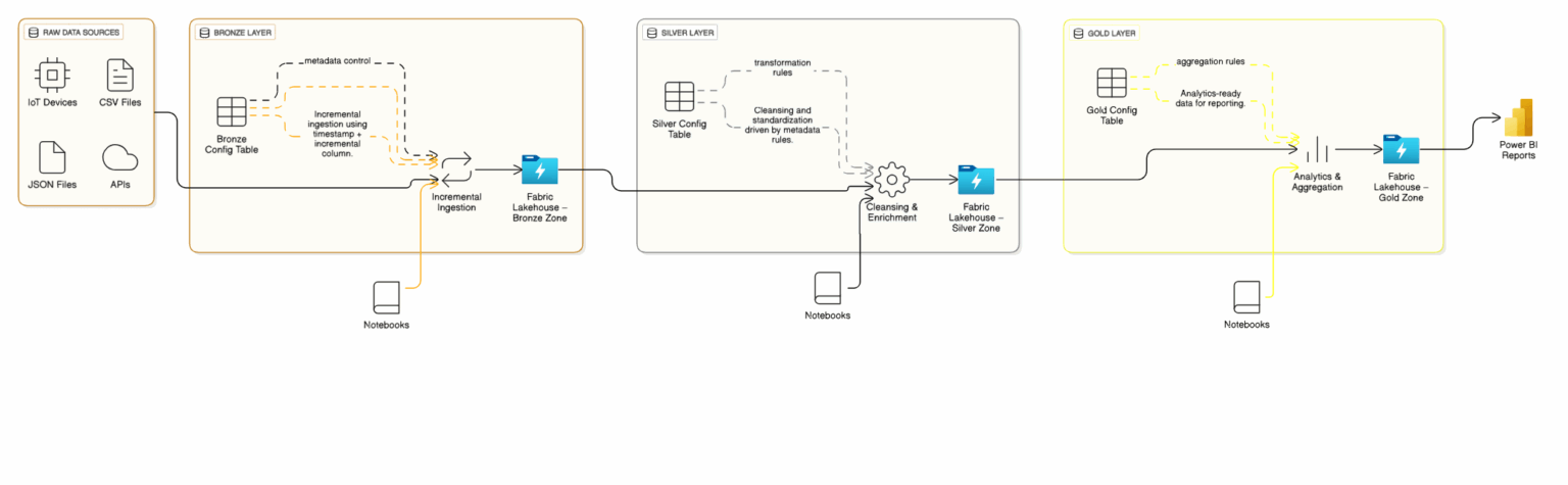In this Microsoft Fabric implementation, the Bronze layer handled incremental ingestion efficiently, while the Silver and Gold layers applied transformation and analytics logic defined entirely by metadata.